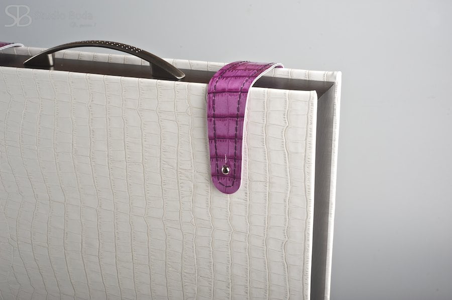 Lorena y Carlos eligieron para su reportaje de boda un álbum digital en formato cuadrado grande de 35 x 35 cm. Las páginas abiertas miden 70 x 35 cm y permiten colocar una media de 4 fotos por cada pagina doble. Para la tapa externa eligieron una foto en blanco y negro y un material brillante, elegante y original al mismo tiempo en los colores blanco y violeta. Este álbum se entregó junto con su maleta «elite» y dos mini-albumes un regalo para los padres.