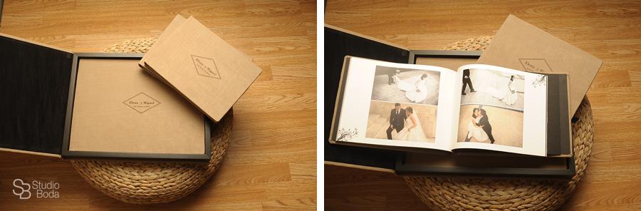 Para su transporte y conservación incluye una caja de madera personalizada a juego con el álbum. También se pueden realizar los álbumes de los padres con las mismas características del álbum grande.