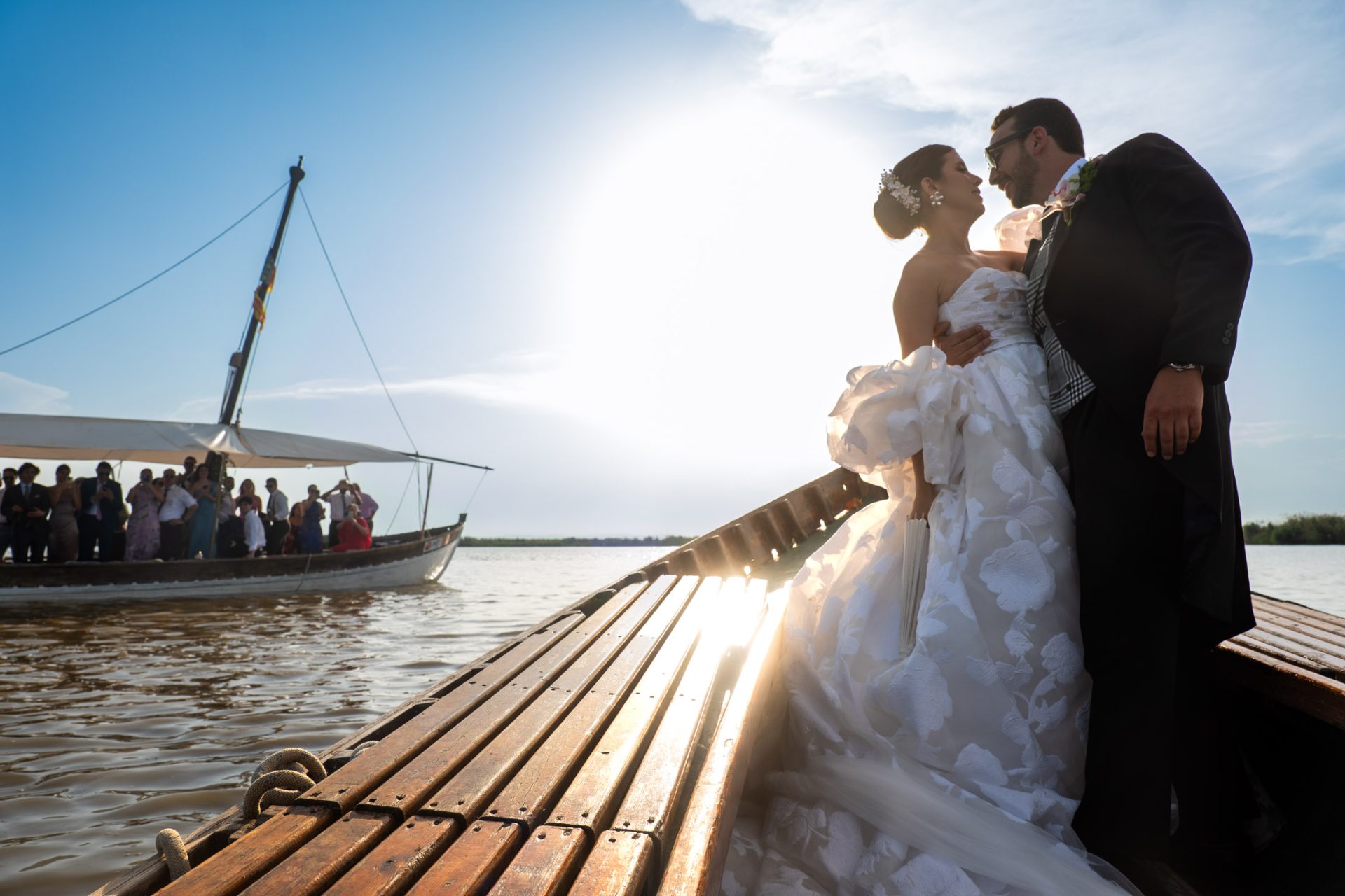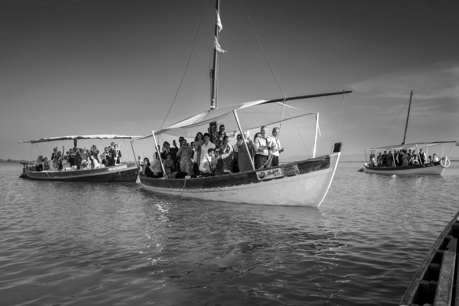 Más de 100 invitados llegaron desde distintos puntos de Europa y Venezuela… sin saber exactamente a dónde. Solo sabían que iban a vivir algo especial. En lugar de un autobús o una típica finca, los llevaron en varias barcas, de paseo por la Albufera de Valencia. Así, sin spoilers.