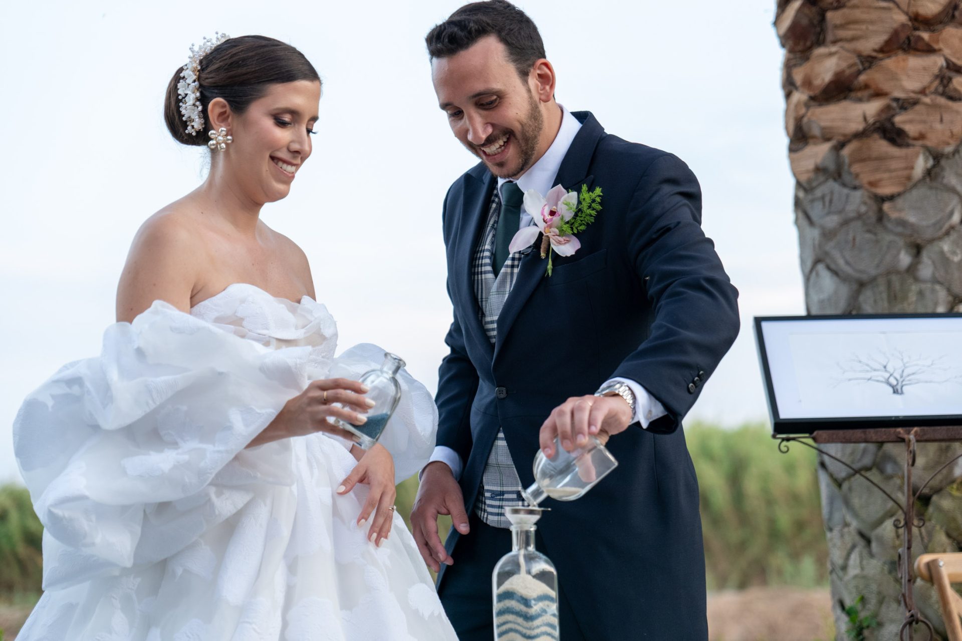 La boda se celebró con un atardecer fabuloso de fondo, reflejado en al agua de la Albufera. De esos que no necesitan filtros. Flamencos cruzando el cielo, palabras sinceras, anillos, promesas, miradas que decían todo sin decir nada. Todos sentían lo mismo: estaba pasando algo bonito de verdad.