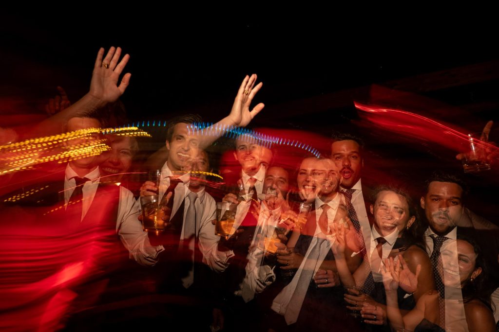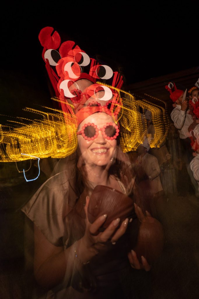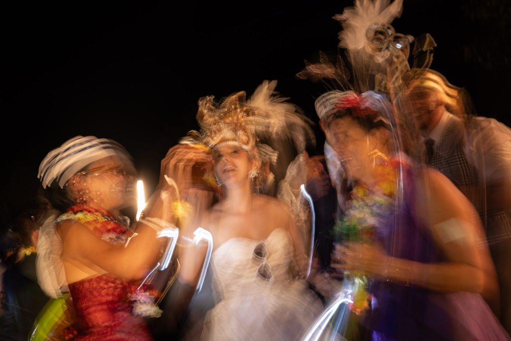Para capturar la energía de la Hora Loca, utilicé un flash externo en modo estroboscópico, sincronizado fuera de cámara, con una ráfaga de 6 destellos por segundo, una exposición de 1/2 segundo, y una sensibilidad ISO entre 800 y 1600, ajustando según la distancia y condiciones de luz. Esta técnica me permite congelar el movimiento dentro de una atmósfera dinámica y caótica, transmitiendo visualmente la intensidad del momento.