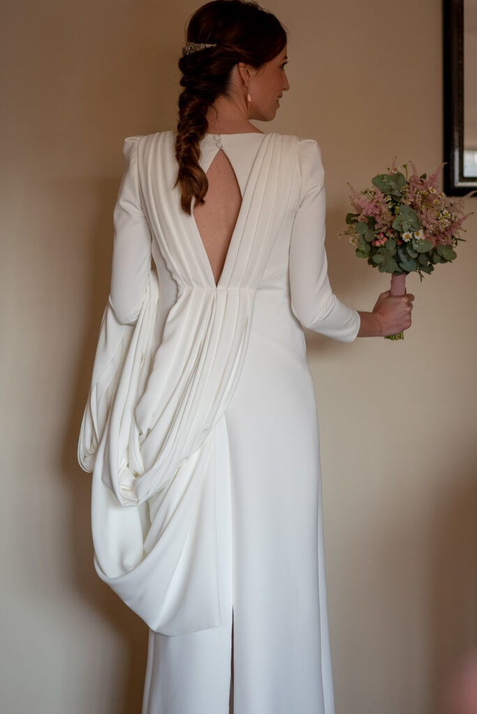 En casa de Elena los preparativos son bien organizados con toda la familia arropando la novia que se siente tranquila y muy feliz. El vestido es precioso, con una larga cola que se mueve como olas en un río. Para las más curiosas: es de Valenzuela atelier de Madrid. Todo está preparado y un coche de época la espera para llevarla a la iglesia…
