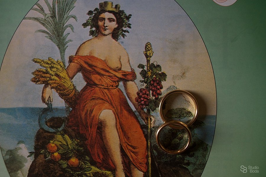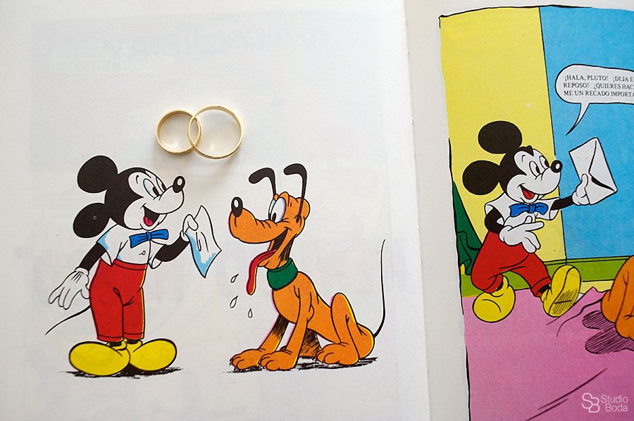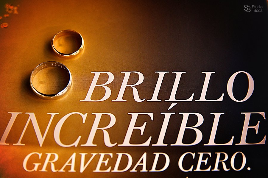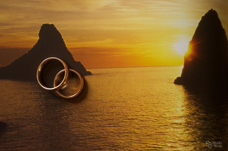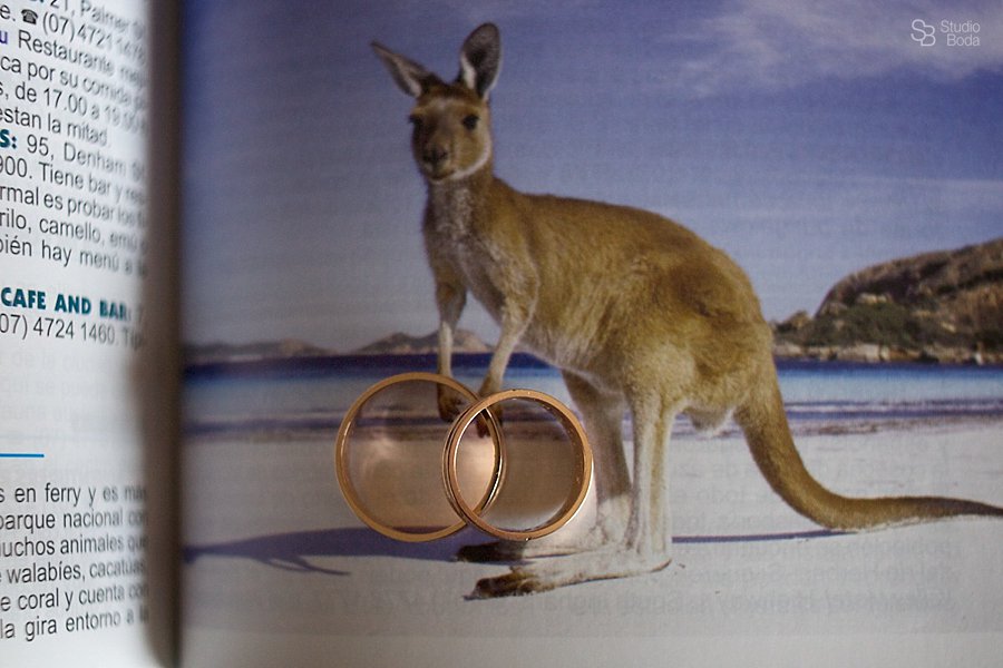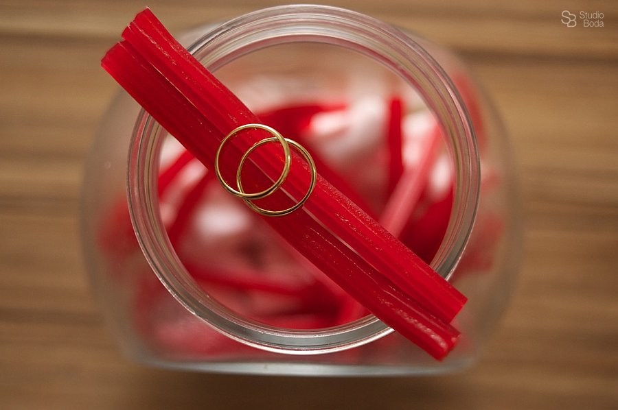 En ciertas situaciones es fácil relacionar los anillos con algo representativo de los novios, como un mapa o un trofeo. Para no repetir he probado con otros elementos ajenos a los novios como un vaso con agua y los he puesto dentro. Los primeros años llegaba a la casa y pedía un libro y los colocaba en la imagen que más me gustaba.