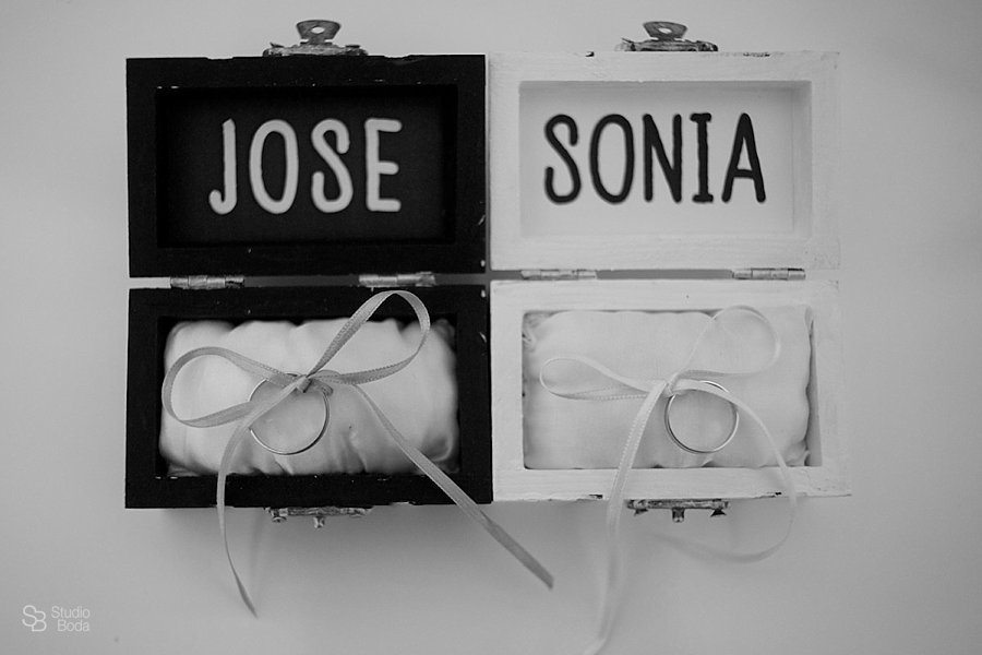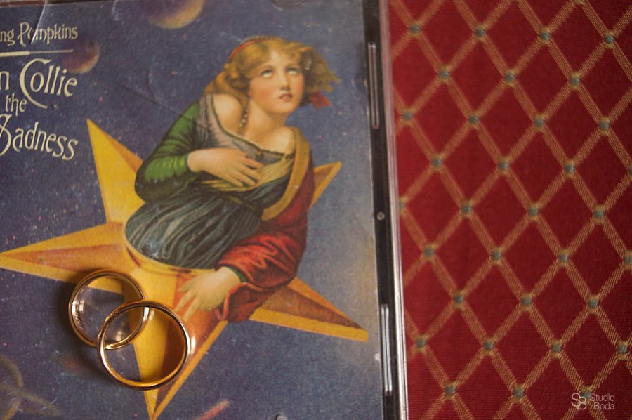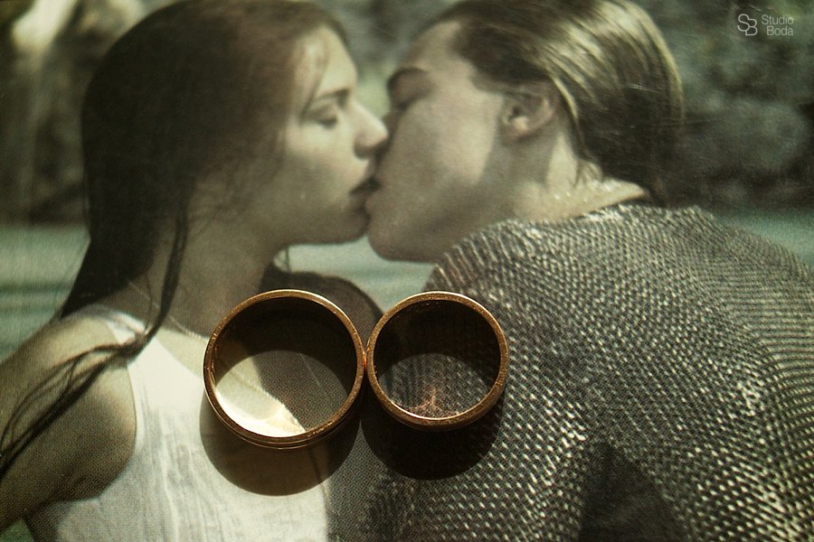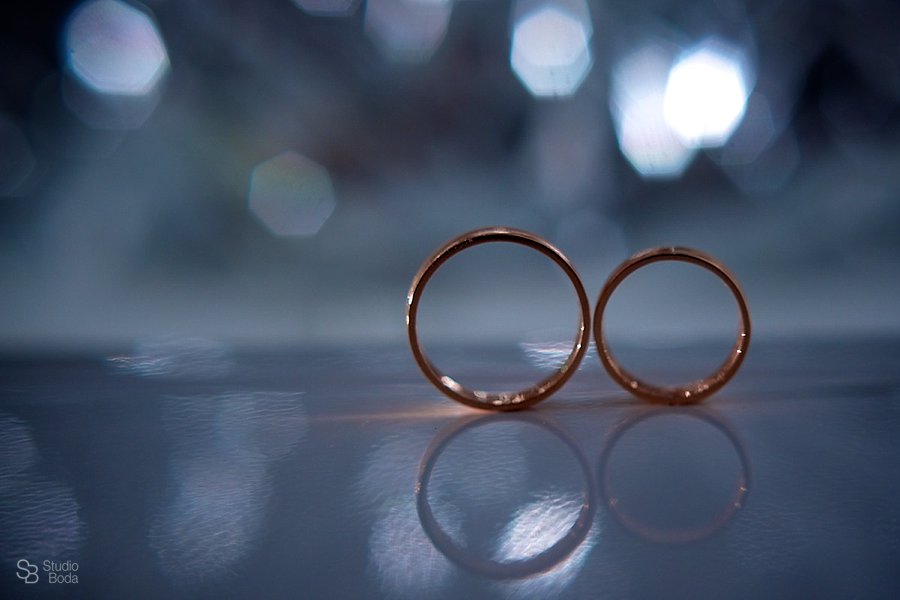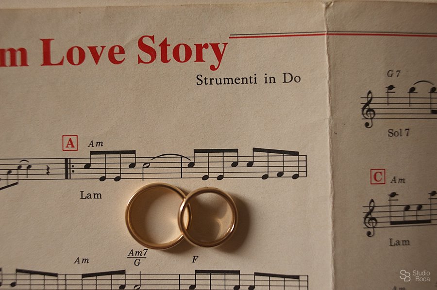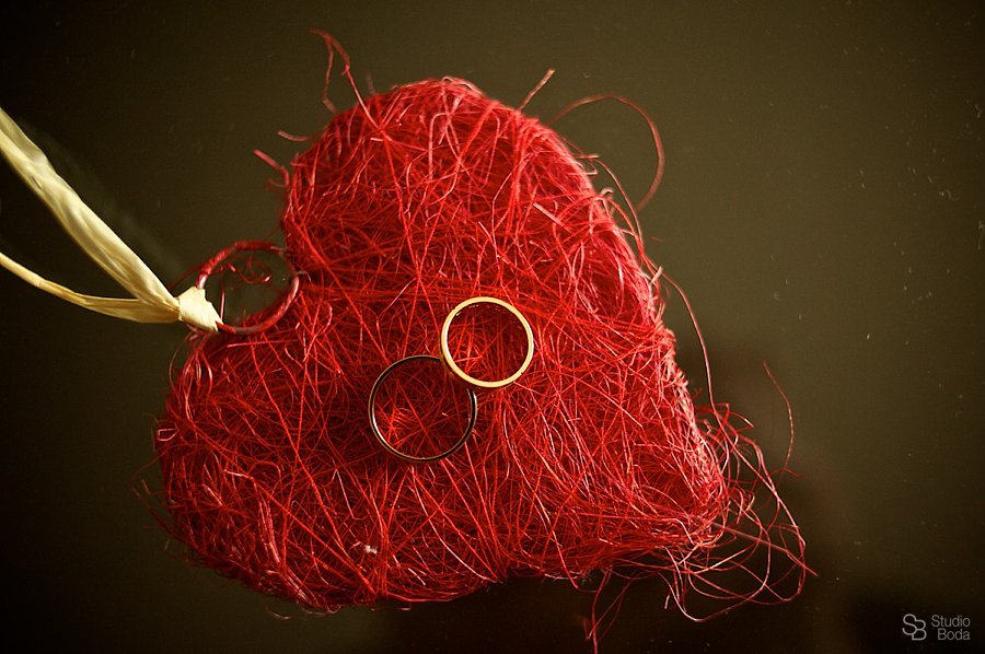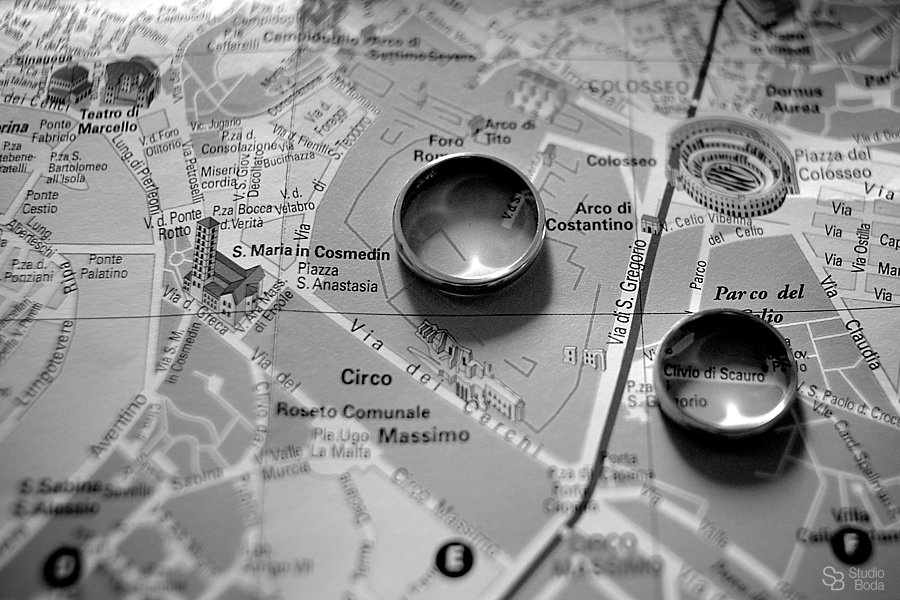 En ciertas situaciones es fácil relacionar los anillos con algo representativo de los novios, como un mapa o un trofeo. Para no repetir he probado con otros elementos ajenos a los novios como un vaso con agua y los he puesto dentro. Los primeros años llegaba a la casa y pedía un libro y los colocaba en la imagen que más me gustaba.