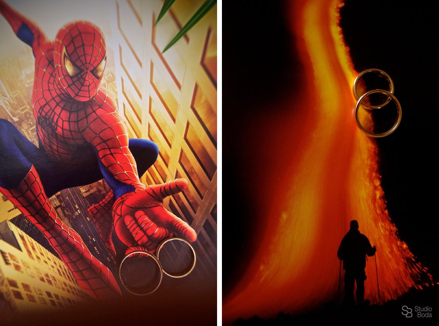 En ciertas situaciones es fácil relacionar los anillos con algo representativo de los novios, como un mapa o un trofeo. Para no repetir he probado con otros elementos ajenos a los novios como un vaso con agua y los he puesto dentro. Los primeros años llegaba a la casa y pedía un libro y los colocaba en la imagen que más me gustaba.