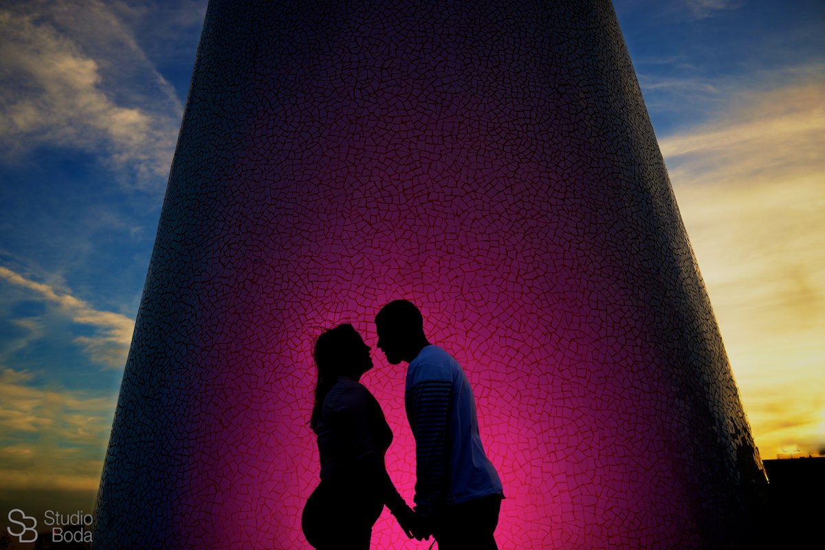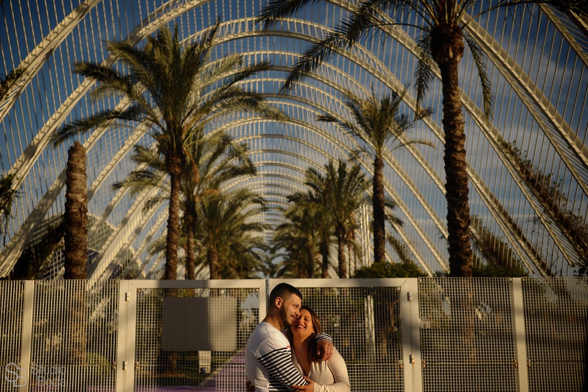 Durante la sesión aprovechamos la preciosa luz de la tarde para crear unos retratos muy simples buscando la naturalidad: sonrisas, miradas y pequeños gestos que dicen mucho. Nos quedamos en la zona del Umbracle siguiendo los rayos del sol hasta el final. Solo usamos un flash en una ocasión para realizar una imagen más original con los conos de Calatrava de fondo.